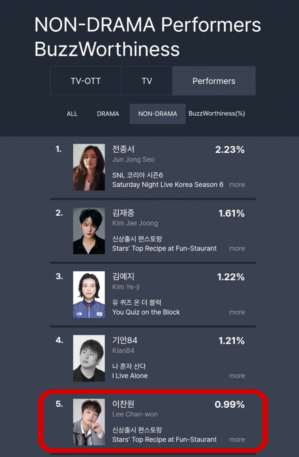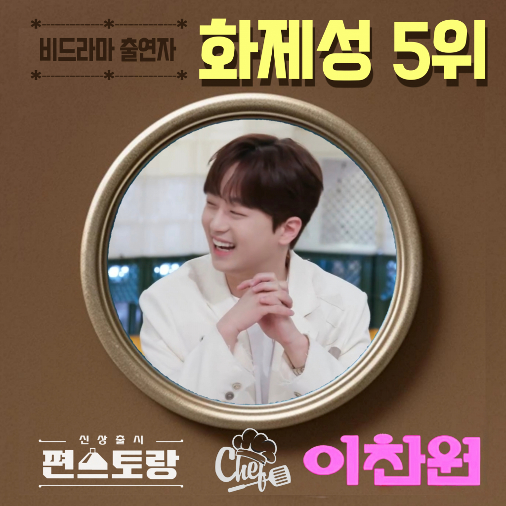 이찬원은 9월 10일 공개된 굿데이터코퍼레이션 2024년 9월 1주 차 화제성 순위에서 KBS 2TV '신상출시 편스토랑'으로 전체 비드라마 출연자 중 5위를 차지했다.