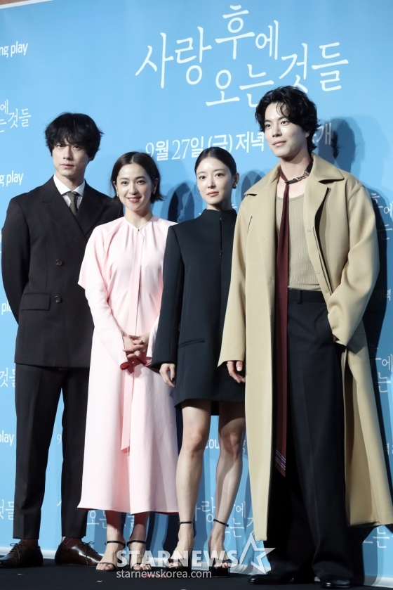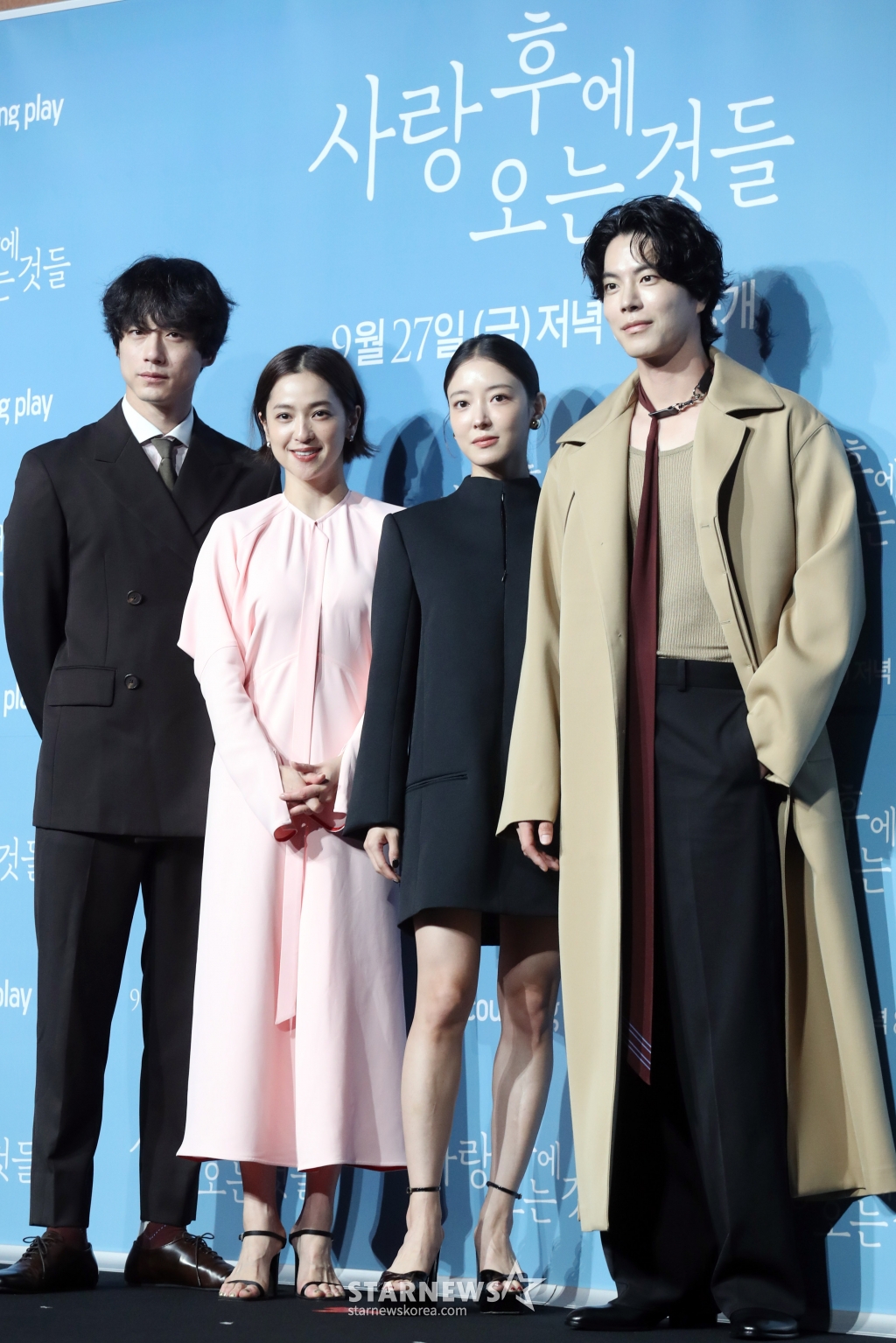 배우 사카구치 켄타로, 나카무라 안, 이세영, 홍종현이 12일 오전 서울 중구 웨스틴 조선호텔 그랜드볼룸에서 열린 쿠팡플레이 시리즈 '사랑후에 오는 것들' 제작발표회에 참석해 포즈를 취하고 있다.