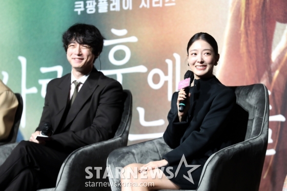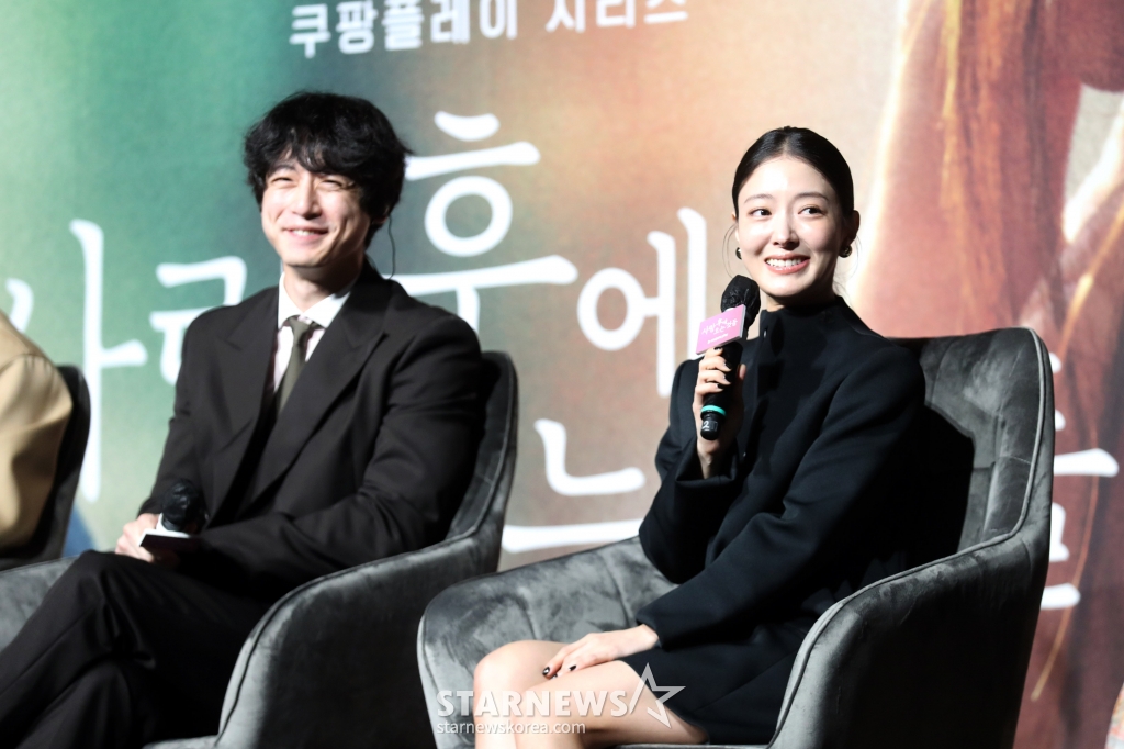 배우 사카구치 켄타로, 이세영이 12일 오전 서울 중구 웨스틴 조선호텔 그랜드볼룸에서 열린 쿠팡플레이 시리즈 '사랑후에 오는 것들' 제작발표회에 참석해 질문에 답하고 있다.