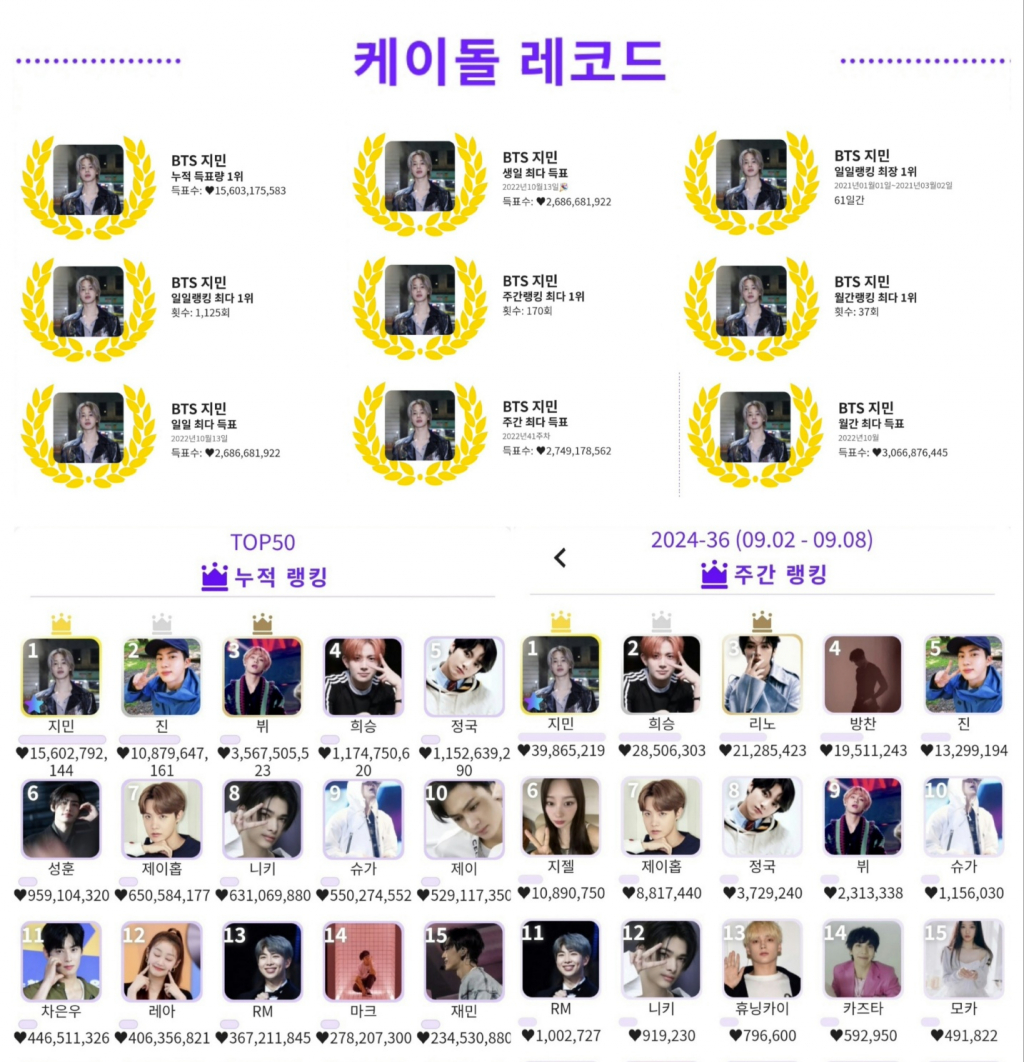지민은 9월 14일 기준, 누적 득표량 1위(156억 281만 7344), 일일 랭킹 최다 1위(1125회), 주간랭킹 최다 1위(170회), 월간랭킹 최다 1위(37회), 일일 최다 득표(26억 8668만 1922), 주간 최다 득표(27억 4917만 8562), 월간 최다 득표(30억 6687만 6445), 생일 최다 득표(26억 8668만 1922), 일일랭킹 최장 1위(61일간) 등 명예의 전당 9관왕을 차지했다.
