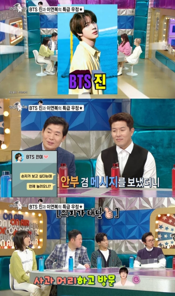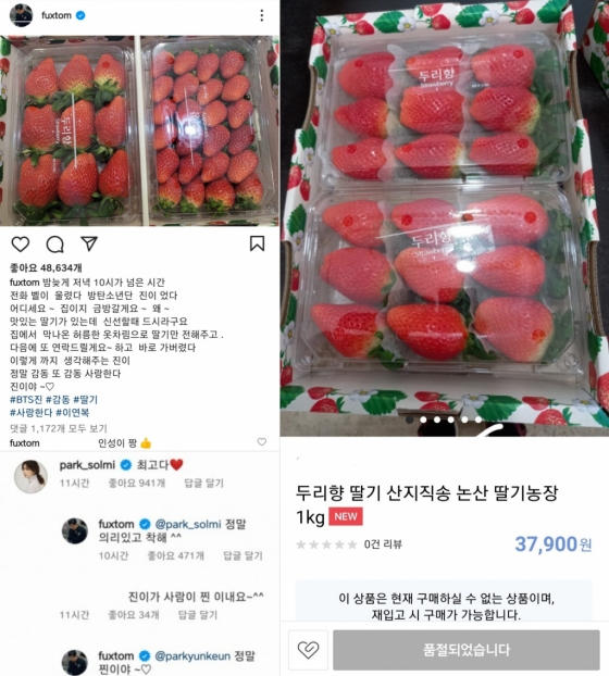 또 "진이 자기가 집에서 먹다가 너무 맛있다고 슬리퍼 차림으로 차를 타고 와서 딸기만 전해주고 갔다"며 사람들을 챙기는 다정다감한 진에게 애정을 드러냈다. 진이 이연복에게 선물한 두리향 딸기는 순식간에 품절되며 진의 폭발적인 인기와 영향력을 실감케 했다.