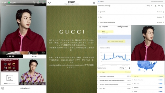 일본에 진이 구찌 글로벌 앰버서더로 발탁됐다는 라인 알림이 공지된 즉시 공식 구찌 웹사이트에 트래픽이 몰리며 다운됐다. 또 미국 등 전 세계의 구글 '구찌' 관련 토픽에서 진이 1위를 기록했다.