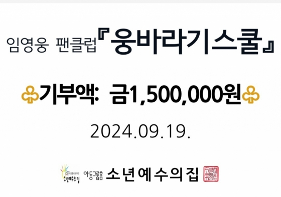 임영웅 팬클럽 '웅바라기스쿨' 회원들이 9월 19일 소년예수의집에 150만 원을 후원했다.