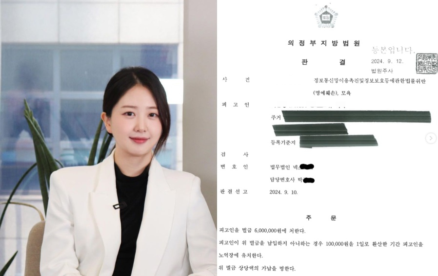 방송인 박수홍 아내 김다예가 박수홍 형수 친구의 악플 관련 혐의 벌금형 선고 사실을 알렸다.