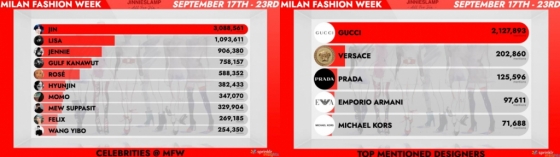 진은 300만 건 이상의 언급량으로 글로벌 고객경험관리 플랫폼 Sprinklr에서 발표한 '밀라노 패션 위크에서 가장 많이 언급된 셀러브리티' 전 세계 1위를 차지했다. 또한 진이 글로벌 앰버서더인 구찌는 200만 건 이상의 언급량으로 전 세계 1위로 언급된 디자이너였다. 이는 최고 글로벌 슈퍼스타의 진의 독보적인 인기와 영향력을 실감케 했다.