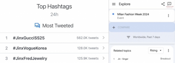 진은 한국 시간 20일, 24시간 동안 전 세계 X(옛 트위터)에서 가장 많이 트윗된 1위부터 3위를 차지했다. 또한 진은 20일 현재까지 지난 7일간 '2024 밀라노 패션 위크' 관련 구글 검색어 토픽 전 세계 1위에 오르며 글로벌 패션 아이콘으로서의 눈부신 면모를 빛냈다.
