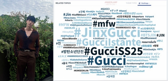 방탄소년단(BTS) 진이 '밀라노 패션 위크'(Milan Fashion Week)에서 가장 많이 언급된 셀럽 1위를 차지하며 '글로벌 슈퍼스타' 위상을 빛냈다.