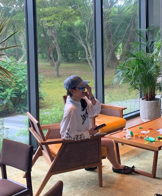 또한 손예진은 무성한 나무가 보이는 통창 건물에 방문했음을 인증했다. 특히 앞에 놓인 테이블에는 손예진이 아들이 가지고 논 것으로 보이는 레고가 놓여져 있다.