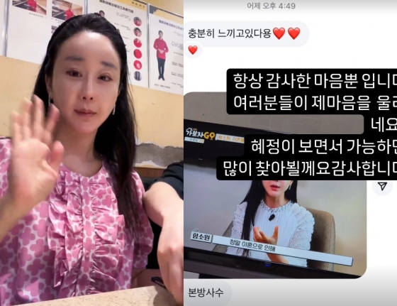 함소원은 지난 21일 자신의 인스타그램 스토리에 "항상 감사한 마음뿐"이라며 "여러분들이 내 마음을 울린다. 혜정이 보면서 가능하면 많이 찾아뵈겠다. 감사하다"라고 고마움을 드러냈다.