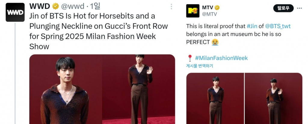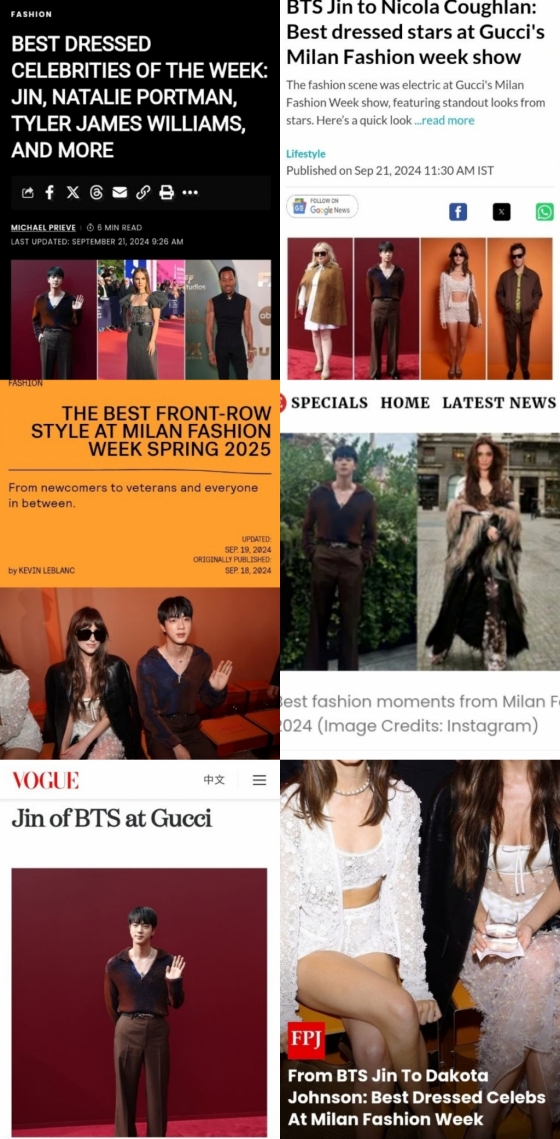 진은 밀라노 현장뿐 아니라 전 세계의 독보적인 반응과 언급량으로 '밀라노 패션 위크에서 가장 많이 언급된 셀러브리티' 1위를 차지하는 등 최고 글로벌 슈퍼스타의 압도적인 인기와 파워를 증명했다. 구찌와 하이주얼리 메종 프레드(FRED)의 글로벌 앰버서더로서 각각 잇따른 초고속 품절 행진과 공식 홈페이지 다운을 일으킨 진의 첫 패션쇼 참석은 전 세계의 폭발적인 반응을 불러 일으켰다.