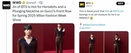 한편 미국 패션 매거진 WWD 공식 계정 등 수많은 전 세계 패션 잡지들이 앞다투어 공식 계정을 통해 구찌쇼에 참석한 진의 사진과 영상을 게재했다. 미국 MTV는 구찌쇼에서의 진의 사진을 게재하며 "진이 너무 완벽해서 미술관에 가야한다는 것을 문자 그대로 증명한 것입니다"라는 문구로 찬사를 보냈다.