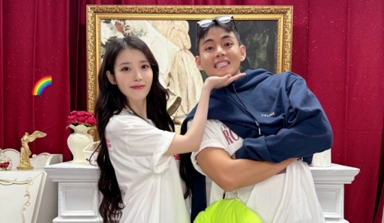 사진 속 뷔는 장난기 가득한 표정으로 아이유와 브이를 하거나 볼하트를 하며 다양한 포즈를 취했다. 아이유는 뷔의 얼굴에 턱받침을 해 다정한 분위기를 자아냈다.