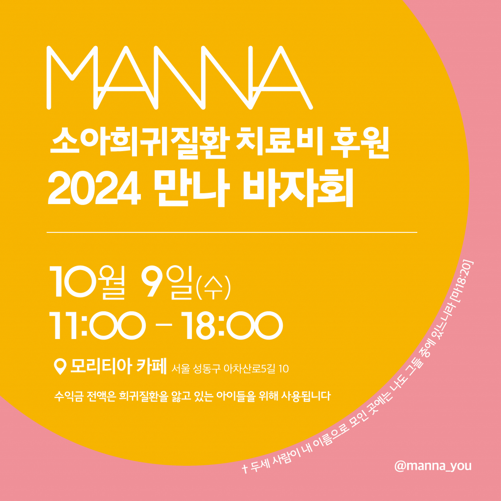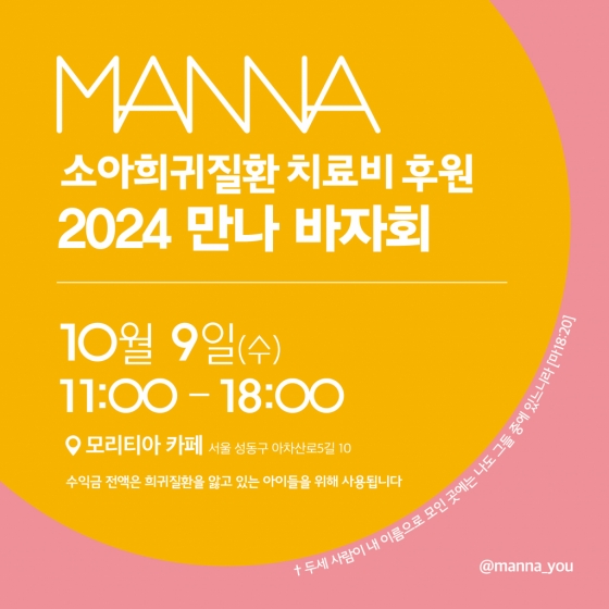 '2024 만나 바자회'는 10월 9일 수요일 성수동 '모리티아 카페'에서 오전 11시부터 오후 6시까지 진행되며 제품 협찬, 현금 후원, 행사 당일 물품 구입 등으로 참여가 가능하다.