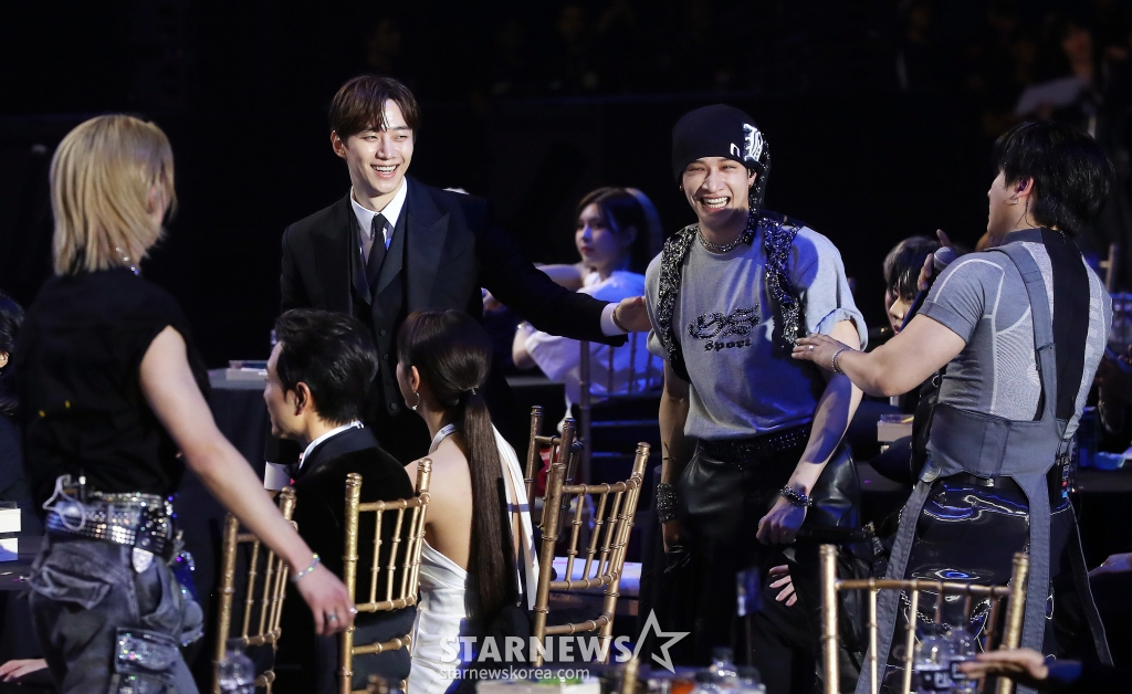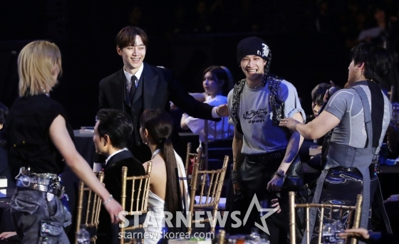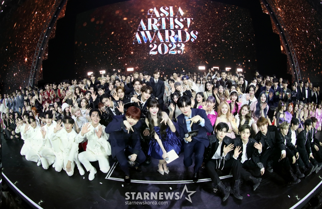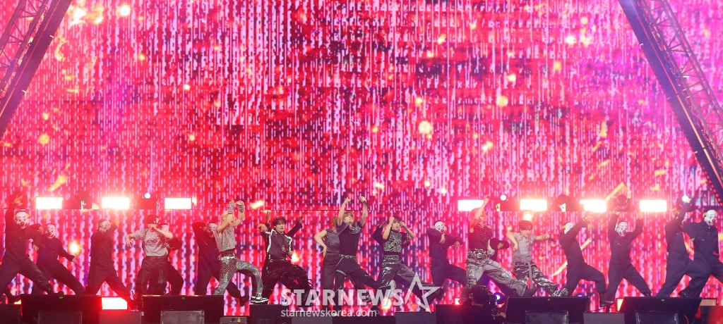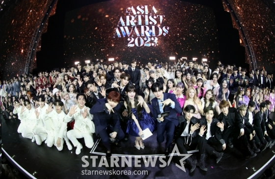 그룹 스트레이키즈(Stray Kids)가 필리핀 아레나에서 열린 '2023 아시아 아티스트 어워즈 인 필리핀'(2023 Asia Artist Awards IN THE PHILIPPINES, 이하 '2023 AAA')에서 배우 이준호와 멋진 무대를 선보이고 있다. /사진=김창현