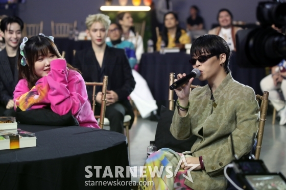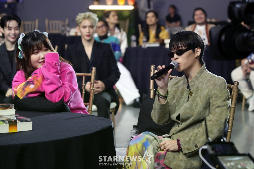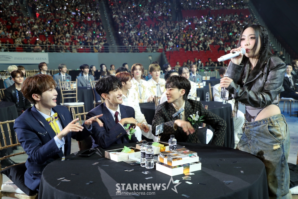 장원영이 필리핀 아레나에서 열린 '2023 아시아 아티스트 어워즈 인 필리핀'(2023 Asia Artist Awards IN THE PHILIPPINES, 이하 '2023 AAA')에서 필리핀 배우 멜라이 칸티베로스 프란시스코와 인터뷰를 하고 있다. /사진=김창현