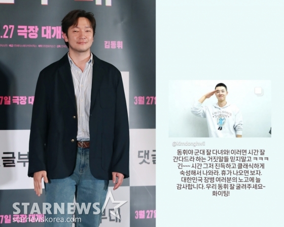 손석구는 24일 자신의 인스타그램에 "동휘야 군대 잘 다녀와. 이러면 시간 잘 간다더라 하는 거짓말들 믿지 말고 긴 시간 그저 진득하고 클래식하게 숙성해서 나와라"라며 "휴가 나오면 보자"라고 김동휘의 사진을 공개했다.