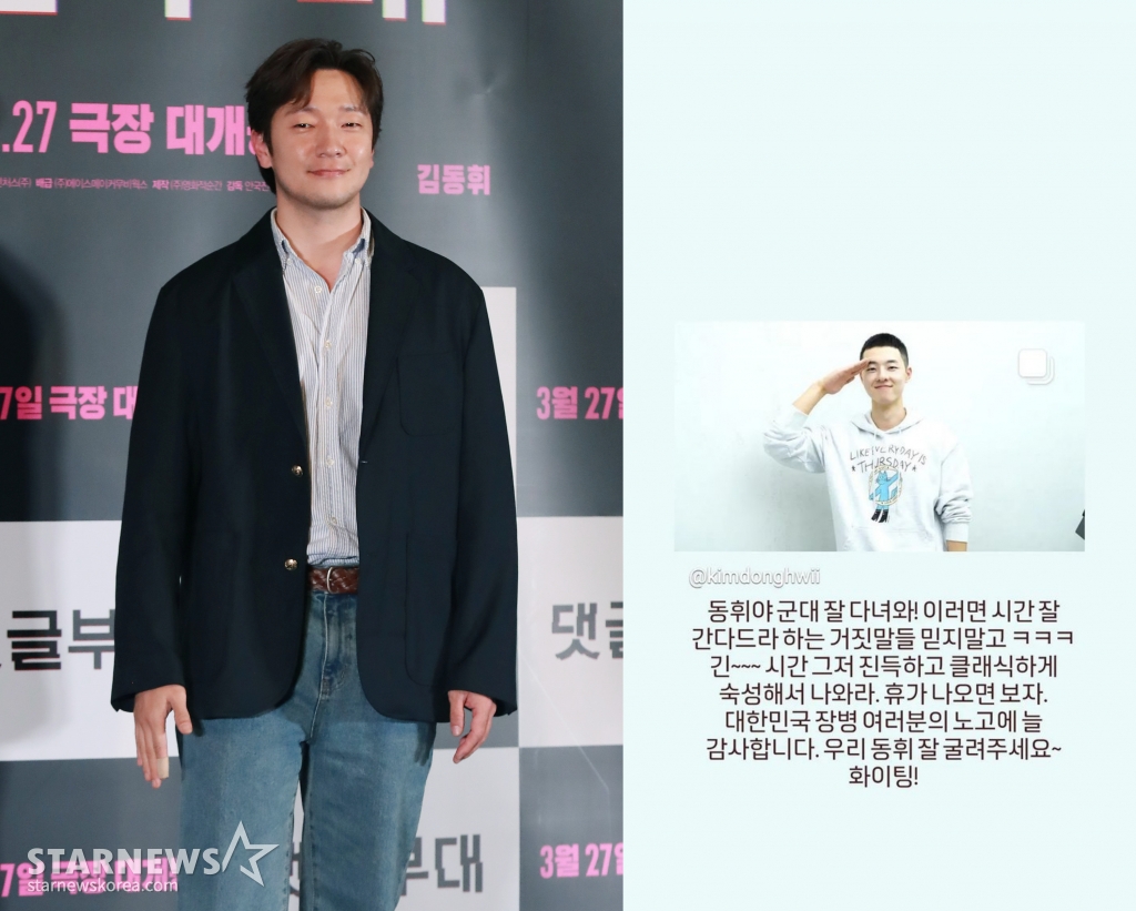 이어 "대한민국 장병 여러분의 노고에 늘 감사합니다. 우리 동휘 잘 굴러주세요. 파이팅"이라고 덧붙였다. 1995년생인 김동휘는 이날 육군 현역으로 입대했다. 김동휘는 연천 육군 제5사단 신병교육대로 입소해 18개월간 국방의 의무를 이행할 예정이다.
