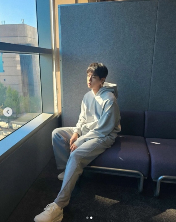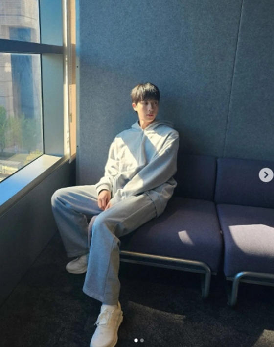 사진 속 진은 회색 트레이닝복에 흰색 운동화를 신고 편안한 모습으로 소파에 앉아 있다. 진은 가을 햇살이 드는 창가에서 망중한을 즐기고 있는 듯한 모습이다.