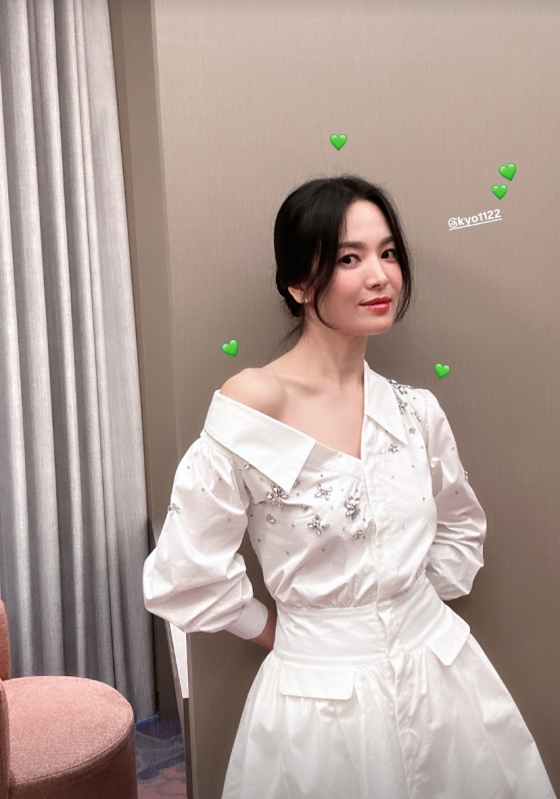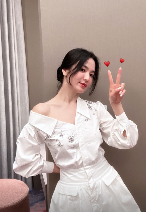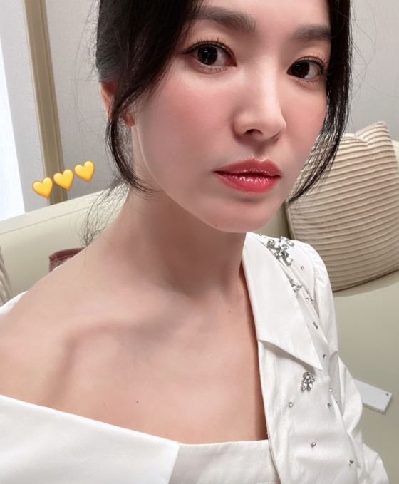 다른 사진들에서도 송혜교는 하트 이모티콘을 몰고 오는 비주얼로 사랑스러움을 더하고 있다.