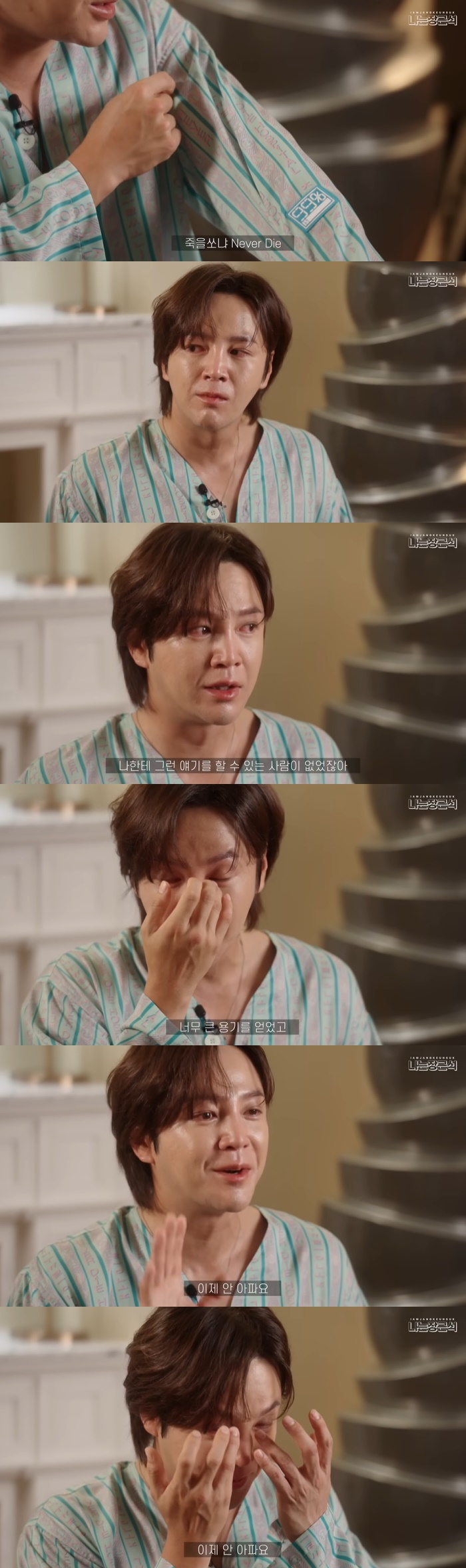 그는 "지인이 운영하는 옷 매장에서 '죽을쏘냐. Never die hospital'이라는 메시지가 적힌 옷을 봤는데 운명처럼 '내가 입어야 하는 옷인데 이렇게 희망적인 메시지가 담겨있다니 싶었다. 너무 큰 용기와 희망을 얻었다. 그때도 형한테 내가 아프단 얘길 안 했는데 지금도 울컥한다"며 눈물을 보였다. 이어 "너무 큰 용기를 얻었고 다 이겨낼 수 있을 것 같았다. 이제는 안 아프다"고 덧붙였다.