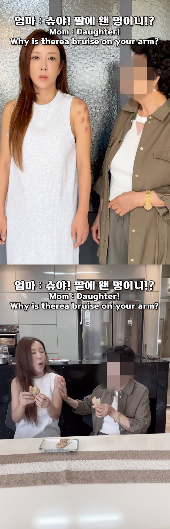 영상 속 슈 어머니는 재미있는 방송을 보거나 맛있는 음식을 먹으면서 연신 슈의 팔을 때렸다. 이에 슈 팔에 멍이 잔뜩 들었다는 콘셉트의 영상인 것.