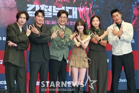 연예방송'강철부대W, 사랑해 주세요'[★포토]발행 : 2024.09.27 ・ 10:44이동훈 기자김희철, 최영재, 김성주, 츄, 장은실, 김동현이 27일 오전 서울 마포구 상암동 스탠포드 호텔에서 진행된 채널A 예능 '강철부대W' 제작발표회에 참석해 포즈를 취하고 있다.최정예 여군 예비역들이 팀을 이뤄 출신 부대의 명예를 걸고 싸우는 밀리터리 서바이벌 프로그램 '강철부대W'는 10월 1일 첫 방송된다. /2024.09.27<저작권자 © 스타뉴스, 무단전재 및 재배포 금지>강철부대W부대강철김희철최영재김성주추천 기사이동훈 기자기자홈좋아요 연예-방송의 인기 급상승 뉴스연예-방송의 최신 뉴스