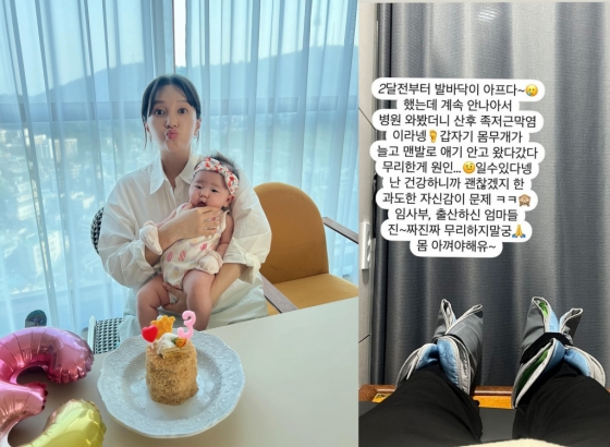 이어 "갑자기 몸무게가 늘고 맨발로 아기 안고 왔다 갔다 무리한 게 원인일 수 있다네"라며 "'난 건강하니까 괜찮겠지' 한 과도한 자신감이 문제"라고 전했다.