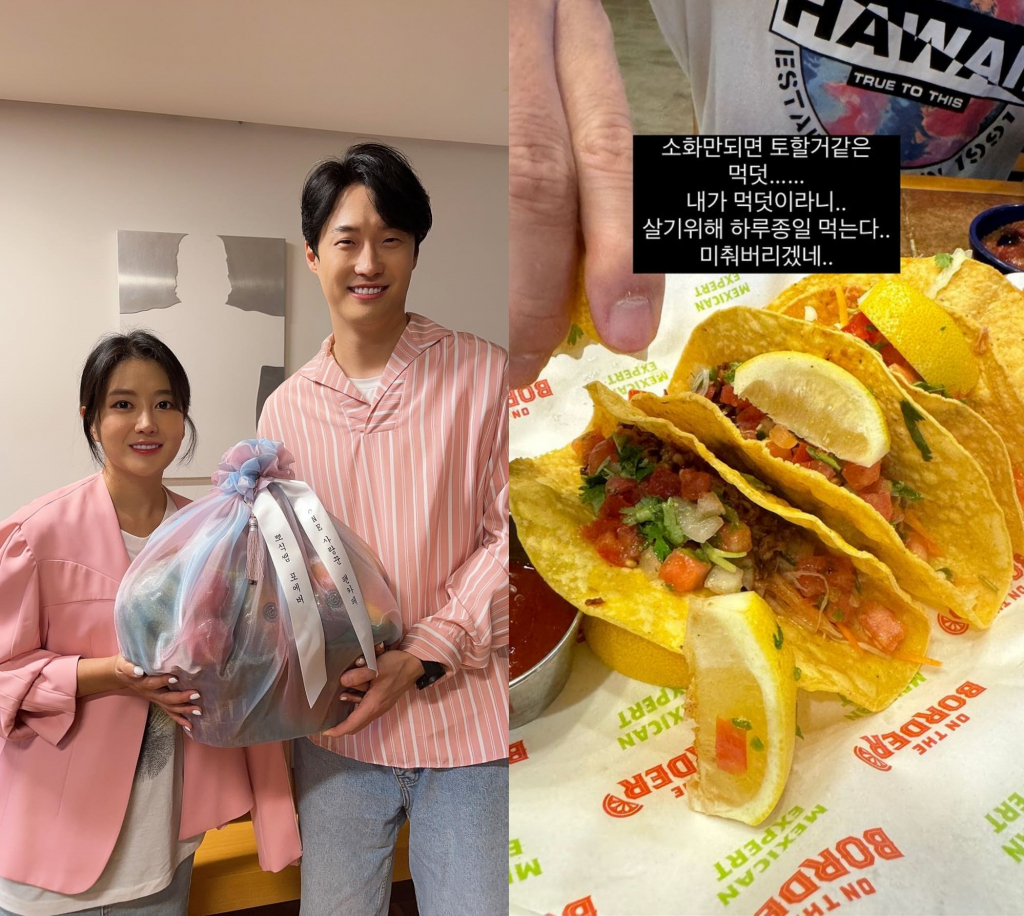 최근 임신을 발표한 이수민은 남편 원혁, 지인과 함께 만남을 가졌고, 공개된 사진 속에는 타코가 담겨있으며 이수민은 "살기 위해 하루종일 먹는다. 미쳐버리겠네"라고 덧붙였다.
