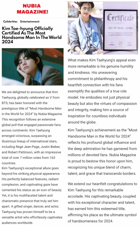 영국 매체 누비아매거진(Nubia Magazine)은 뷔가 '2024년 전 세계에서 가장 잘생긴 남자'의 명예로운 타이틀을 수상했다고 발표했다.