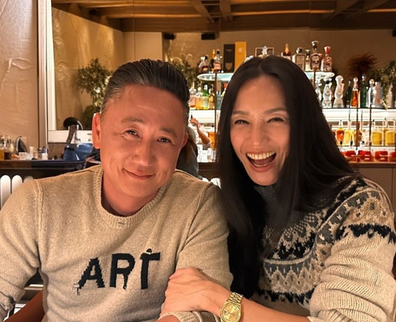 김민은 남편에게 팔짱을 끼고 행복한 미소를 짓고 있다. 그의 남편은 인자하고도 다정한 매력을 발산했다.