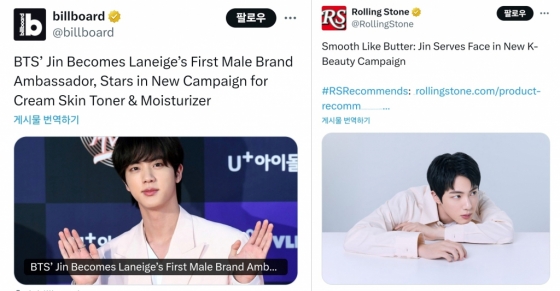 한편 미국 빌보드(Billboard)는 "방탄소년단 진, 라네즈 첫 남성 브랜드 앰버서더로 발탁, 크림 스킨 토너 & 모이스처라이저 신규 캠페인에 출연"이라는 제목의 기사를 냈고, 미국 롤링스톤지(Rolling Stone)는 "Smooth Like Butter: 진, 새로운 K-뷰티 캠페인에서 얼굴 역할"이라는 기사를 통해 방탄소년단의 노래 '버터' 가사를 인용한 제목으로 소식을 전했다.