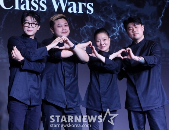 트리플 스타, 요리하는 돌아이, 이모카세 1호, 나폴리 맛피아가 7일 오전 서울 마포구 호텔 나루 서울 엠갤러리에서 진행된 넷플릭스 예능 '흑백요리사: 요리 계급 전쟁' TOP8 기자간담회에 참석해 포즈를 취하고 있다.