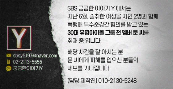 7일 SBS '궁금한 이야기 Y'는 공식 SNS에 "지난 6월, 술취한 여성을 지인 2명과 함께 폭행해 특수준강간 혐의를 받고 있는 30대 유명아이돌 그룹 전 멤버 문 씨를 취재 중"이라고 밝혔다.