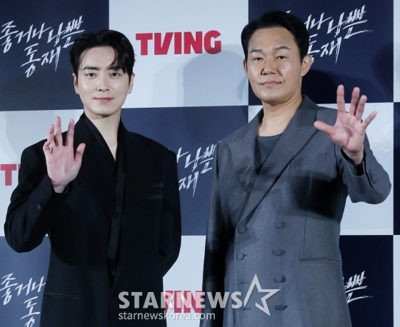 8일 오후 서울 용산구 CGV용산 아이파크몰에선 티빙 새 오리지널 시리즈 '좋거나 나쁜 동재' 제작발표회가 열렸다. 연출자 박건호 감독과 두 주연 이준혁, 박성웅 등이 참석했다.