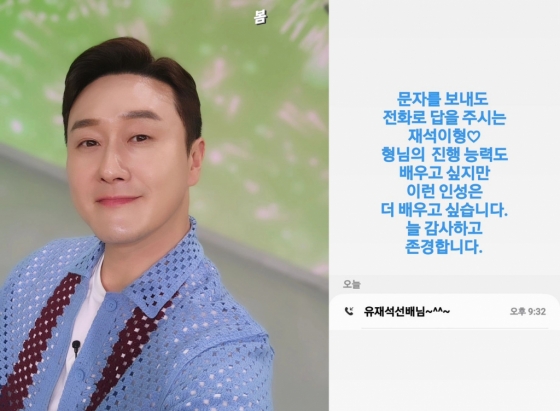 김원효는 8일 자신의 인스타그램에 "문자를 보내도 전화로 답을 주시는 재석이 형"이라는 글과 함께 사진 한장을 공개했다.