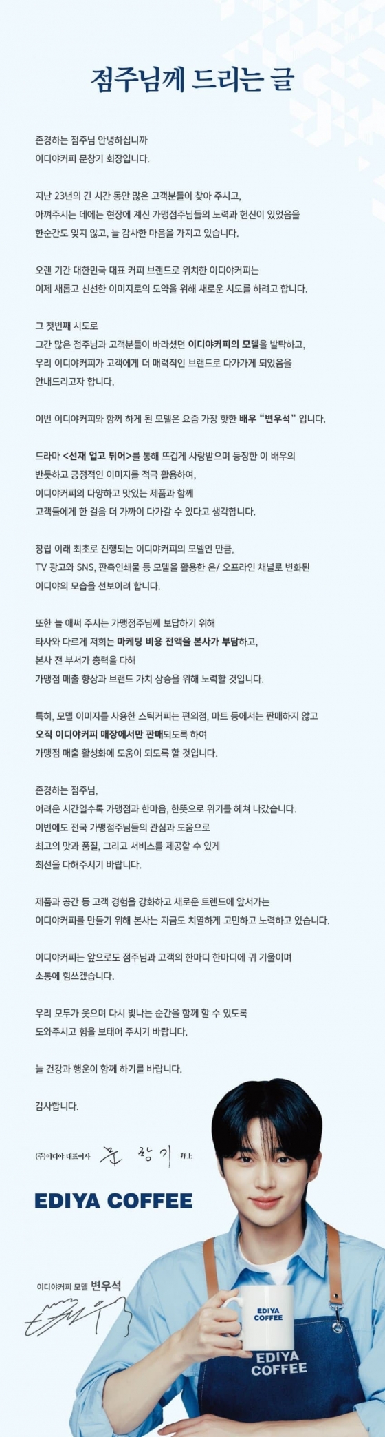 이디야커피 문창기 회장은 10일 "점주님께 드리는 글"이란 제목과 함께 모델 변우석의 기용과 브랜드에서 달라질 점에 대해 공지문을 남겼다. 변우석은 이디야커피 창사 23년 이래 최초로 브랜드 모델이 됐다.