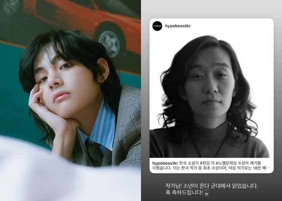 뷔는 지난 10일 인스타그램에 한강이 노벨문학상을 수상한 내용의 기사를 올리면서 "작가님! 소년이 온다. 군대에서 읽었습니다. 흑 축하드립니다"라며 축하의 글을 남겼다.