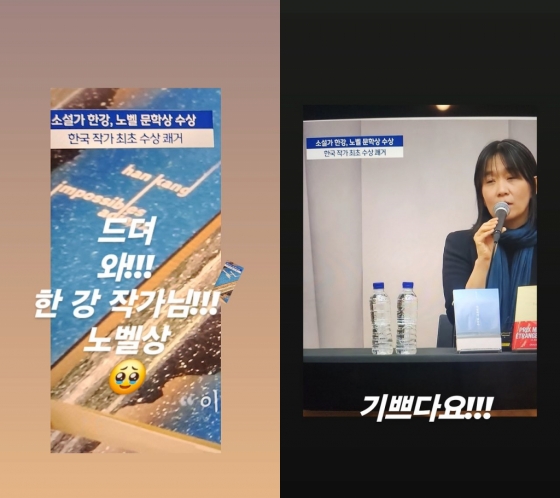 고현정은 10일 자신의 인스타그램에 "드뎌(드디어) 한강 작가님 노벨상"이라며 "기쁘다요"라는 글과 함께 뉴스 화면을 캡처해 공개했다.