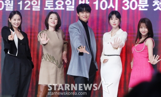배우 김선영, 김성경, 연우진, 김소연, 이세희가 11일 오전 서울 강남구 논현동 엘리에나호텔에서 진행된 JTBC 토일드라마 '정숙한 세일즈' 제작발표회에 참석해 포즈를 취하고 있다.
