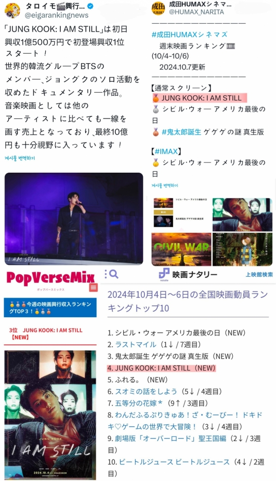 일본 매체에 따르면 '정국: 아이 엠 스틸'은 다큐멘터리 영화임에도 10월 4일~6일 자 전국 영화 관객 동원 랭킹 4위로 톱5 안에 이름을 올렸고, 영화 흥행 수입 랭킹 3위로 톱3에도 랭크됐다.