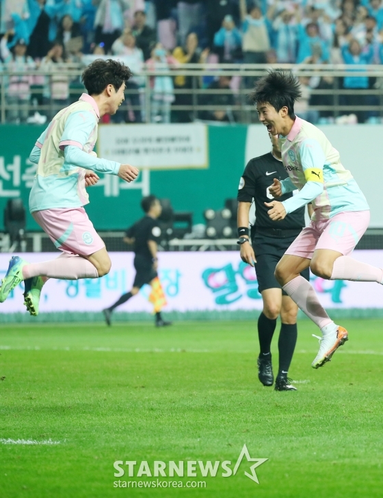 가수 임영웅이 12일 오후 대전 유성구 노은동 대전월드컵경기장에서 열린 '하나은행 자선축구대회 팀 히어로 VS 팀 기성용' 후반전 경기에서 어시스트를 한 뒤 골을 넣은 전원석과 기뻐하고 있다. 2024.10.12