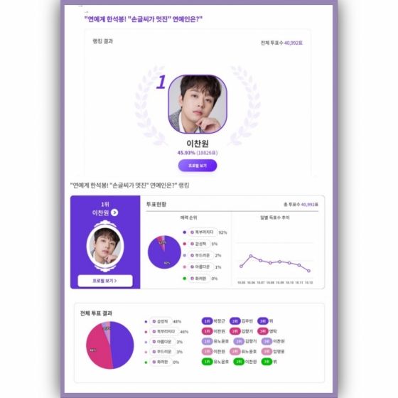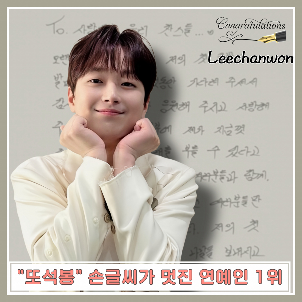 이찬원은 10월 6일부터 10월 12일까지 익사이팅 디시에서 진행된 '연예계의 한석봉! '손글씨가 멋진' 연예인은?' 설문에서 1위를 차지했다.