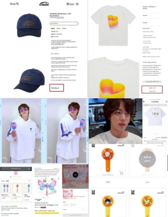진은 입대 전은 물론, 2022년 12월 입대 후에도 광고 상품은 물론 착용한 패션 상품, 먹고 마시는 식품 등 관련 상품들이 초고속 품절 행진을 일으키며 초특급 '진 이펙트'를 쉴 새 없이 증명하고 있다.