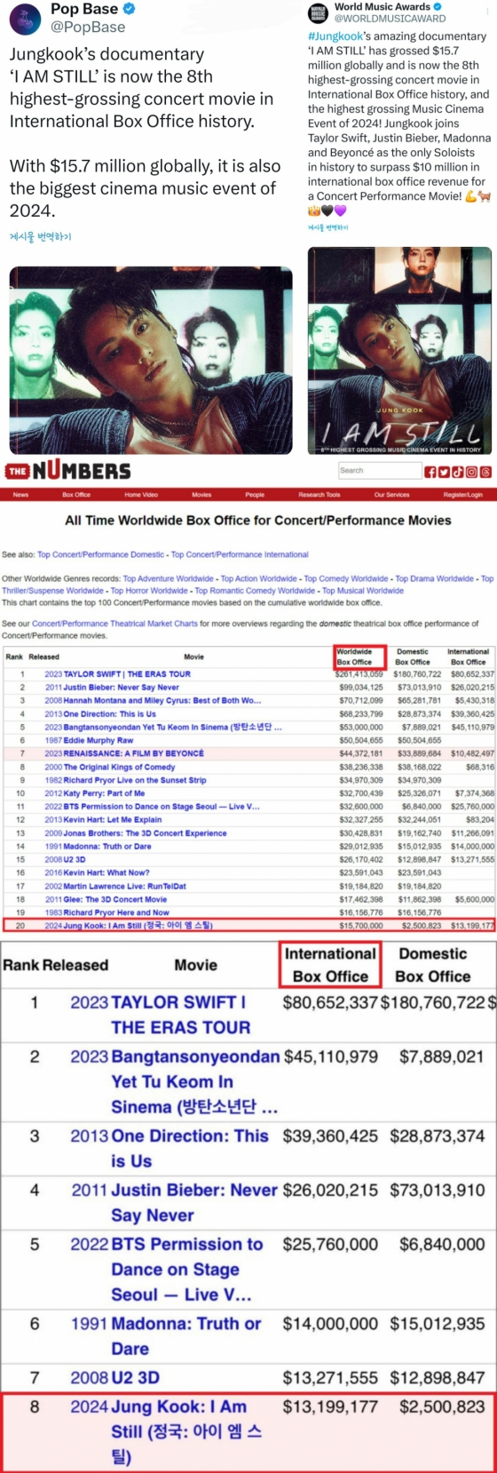 대중 문화 관련 엔터테인먼트, 뉴스, 통계, 차트 등을 전하는 '팝베이스'(Pop Base) 공식 계정은 지난 15일 '정국: 아이 엠 스틸'이 현재 인터내셔널(International) 박스오피스 역사상 여덟 번째로 높은 수익을 올린 콘서트 영화로 등극했다고 했다. 또 2024년 전 세계적으로 가장 큰 수익을 창출한 뮤직 영화 이벤트라고 덧붙이는 등 정국이 세운 기록들을 집중 조명했다.