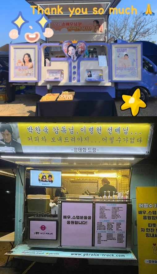 하루 전에는 배우 이병헌이 엄태화 감독이 보낸 커피차 사진을 자랑했다. 엄태화 감독은 영화 '쓰리, 몬스터' 촬영 당시 박찬욱 감독, 이병헌과 함께 했던 사진과 함께 "박찬욱 감독님, 이병헌 선배님 커피차 보내드려야지. 어쩔수가없다"라고 쓰며 남다른 친분과 센스를 자랑했다.