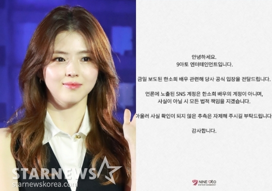 16일 소속사 9ato엔터테인먼트는 공식 SNS에 "언론에 노출된 SNS 계정은 한소희 배우의 계정이 아니며 사실이 아닐 시 모든 법적 책임을 지겠다"라고 밝혔다.