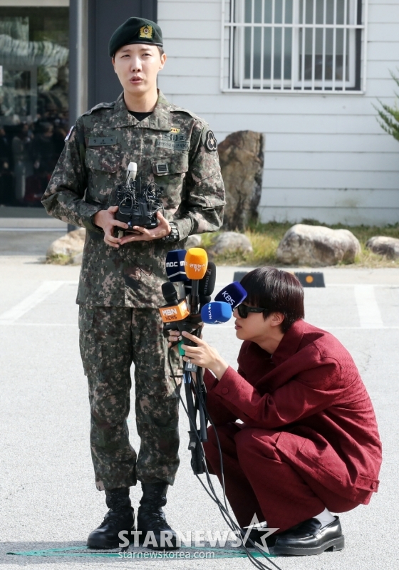이내 제이홉은 "일단 너무 감사하다. 건강하게 전역했다"라며 "먼 길 와주신 기자님들께 감사 인사를 드리고 싶다. 그리고 팬 여러분 덕분이다"라고 말문을 열었다.