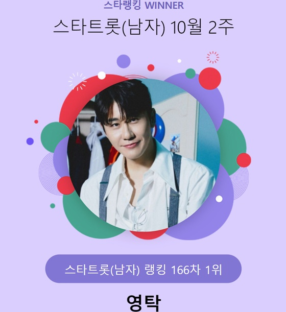 영탁은 10일 오후 3시 1분부터 17일 오후 3시까지 진행된 10월 2주(166차) 스타랭킹 스타트롯 남자 랭킹에서 9만 1459표를 받으며 1위 자리를 지켰다.