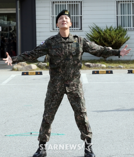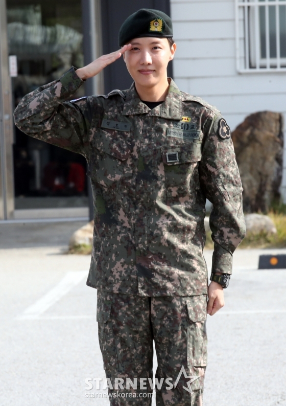 제이홉은 거듭 "기다려 주셔서 너무 감사드린다. 정말 큰 응원과 성원, 사랑을 주셔서 감사하다. 건강하게 잘 전역했다. 충성"이라고 진심을 전했다.