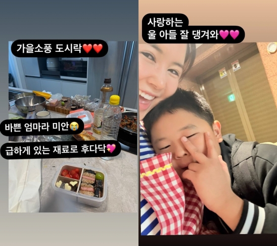 장영란은 "바쁜 엄마라 미안. 급하게 있는 재료로 후다닥"이라고 전했다. 장영란은 바쁜 일정 중에도 아들의 소풍 도시락을 싼 것으로 보인다. 이어 "다음엔 미리 미리 준비해서 더 멋지게 싸줄게"라고 덧붙였다.